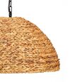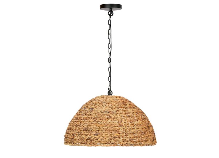 Available in medium and large sizes, it features a handwoven water hyacinth shade paired with a matte black iron frame and chain.