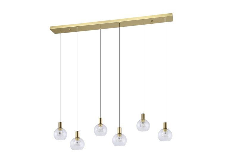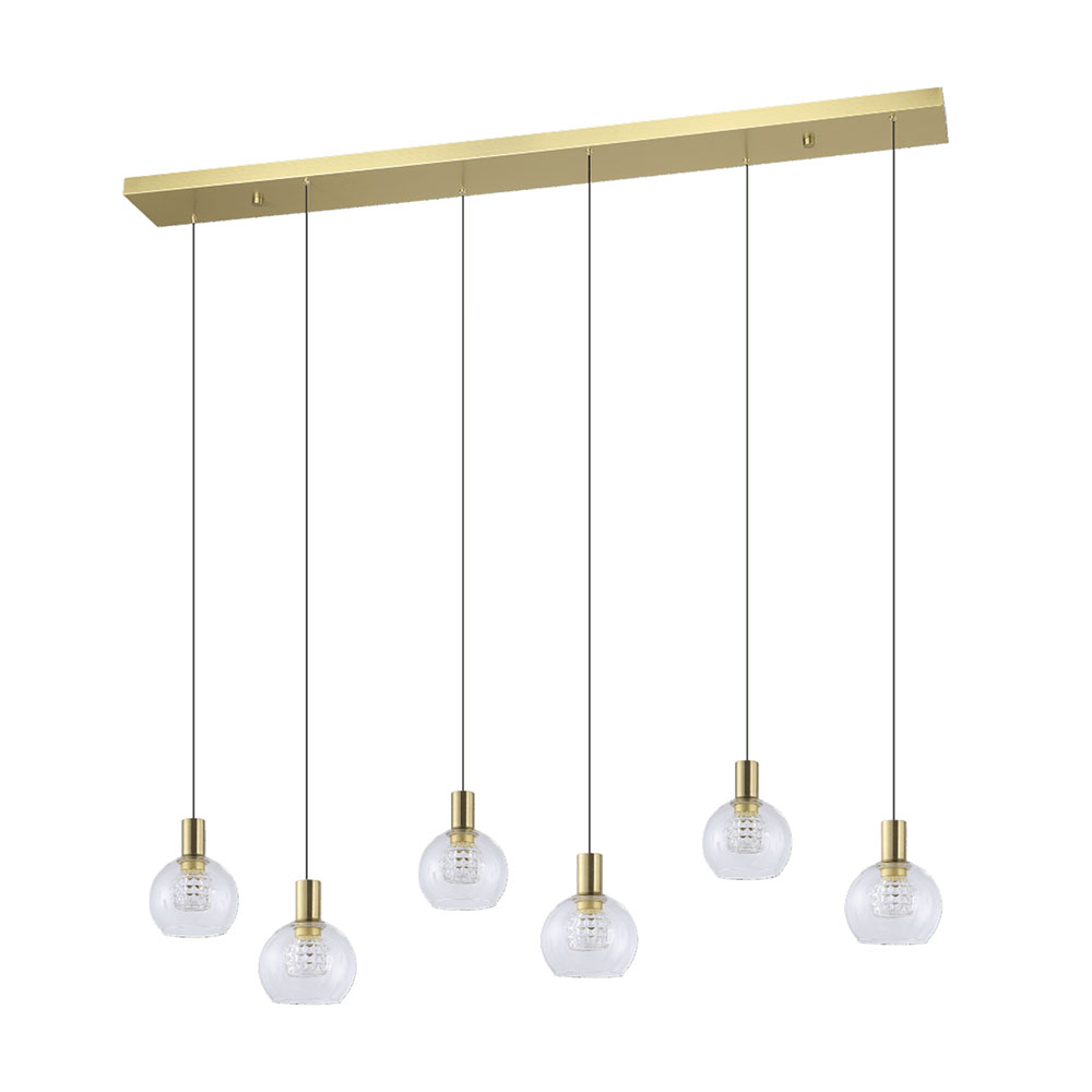 The TERQUE LED pendant light showcases elegant charm, featuring a black, elongated canopy with six suspended clear glass ball lampshades.