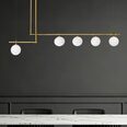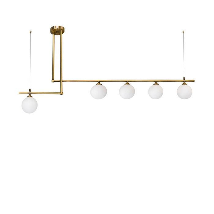 This modern fixture showcases a sophisticated gold metal frame that elegantly contrasts with seven beautifully crafted opal glass shades, creating a stunning visual effect.