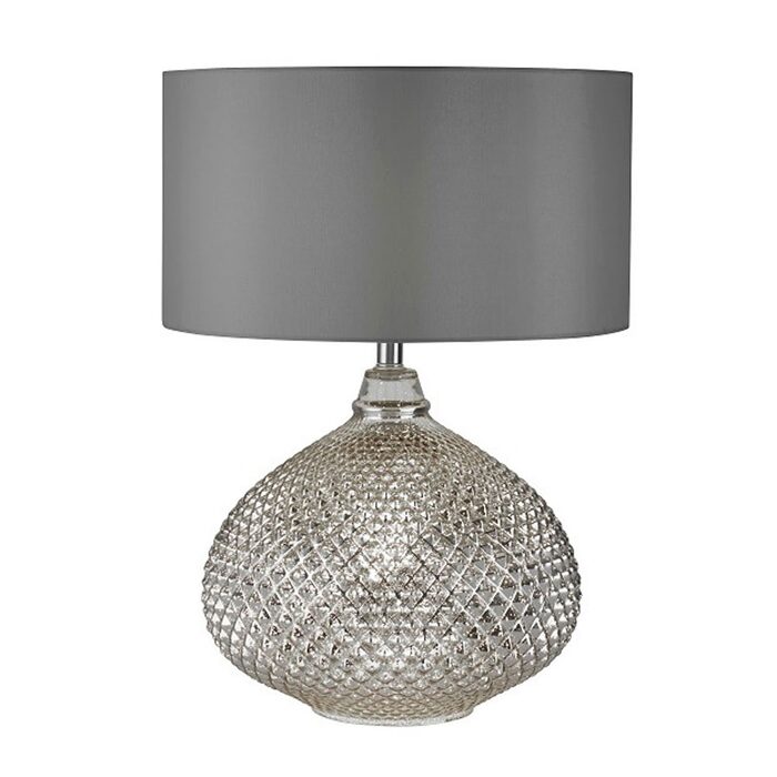 Add some design flair to your space with this textured silver glass base with a simple silver fabric shade.