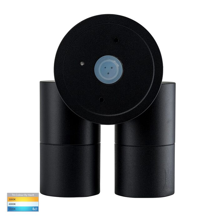 The HV1326T-PIR is a Havit Tivah Double Adjustable Spot Light in black, featuring integrated TRI-Colour LED (3000K/4000K/5500K), a built-in PIR motion sensor with 10m/120° range, 90° tilt & 270° swivel for each head, IP65 weatherproofing, and manual override.