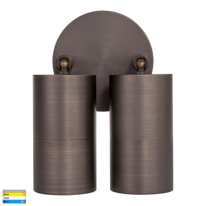 Featuring two adjustable GU10 spotlight heads that offer 90° tilt & 270° swivel, IP65 weather protection, TRI-Colour (3000K/4000K/5500K) LED globes included, and designed for 240V AC power, perfect for illuminating walls, patios, or pathways.