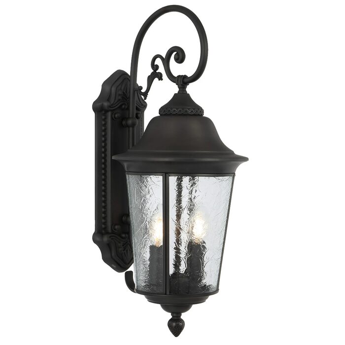 Available in solid brass or sleek black finish, this outdoor fixture features enchanting water glass, reminiscent of antique French lanterns.