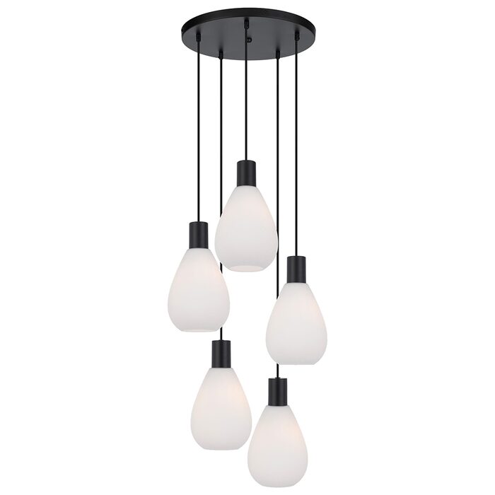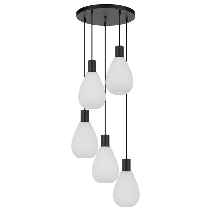 The glass is offered in opal matt, the metalware is a rich satin black, while the pendants are suspended with textile cable.
