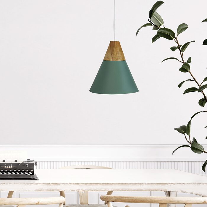 The designer styling of the Trigo includes matt finish paint, sculptured timber block on top of the conical shade and cloth covered cord suspension.