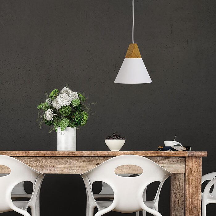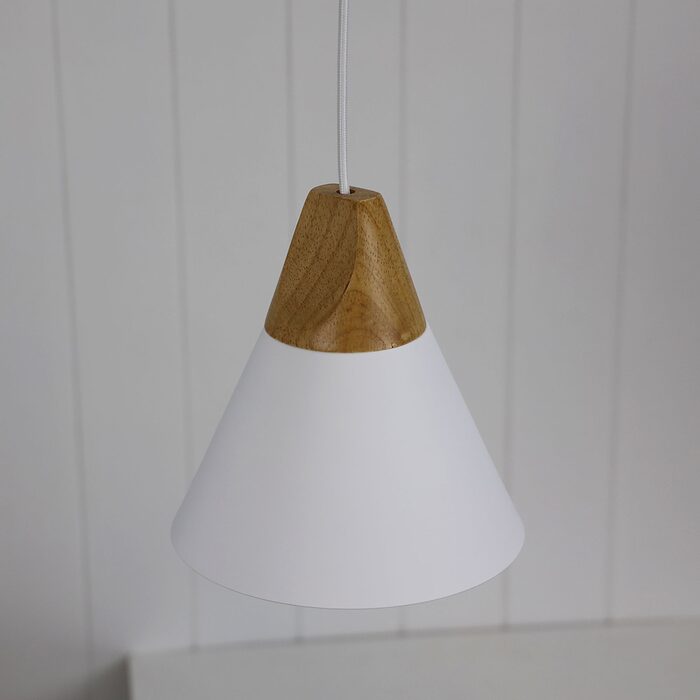 The designer styling of the Trigo includes matt finish paint, sculptured timber block on top of the conical shade and cloth covered cord suspension.