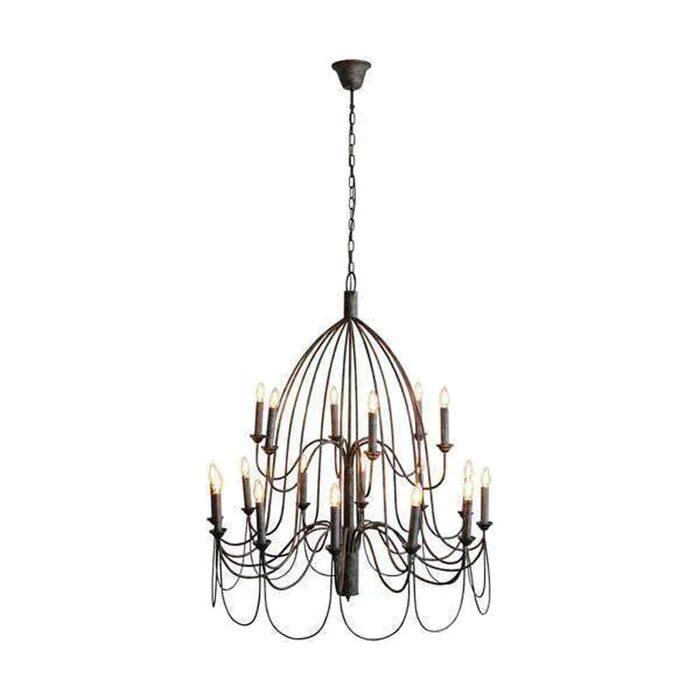 The arms intersect with a subtle wrapped wire detail and support 18 candelabra light bulbs with circular bobeches.