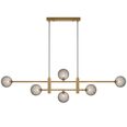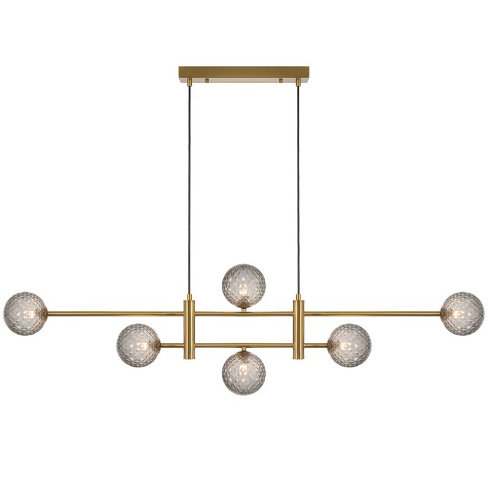 Offered in refined black and antique gold finishes, this pendant displays six lights elegantly positioned along a sleek central rod, making a striking visual impact.