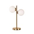 The VALCROSS decorative 2 light table lamp, satin brass metalware with opal matt glass spheres.