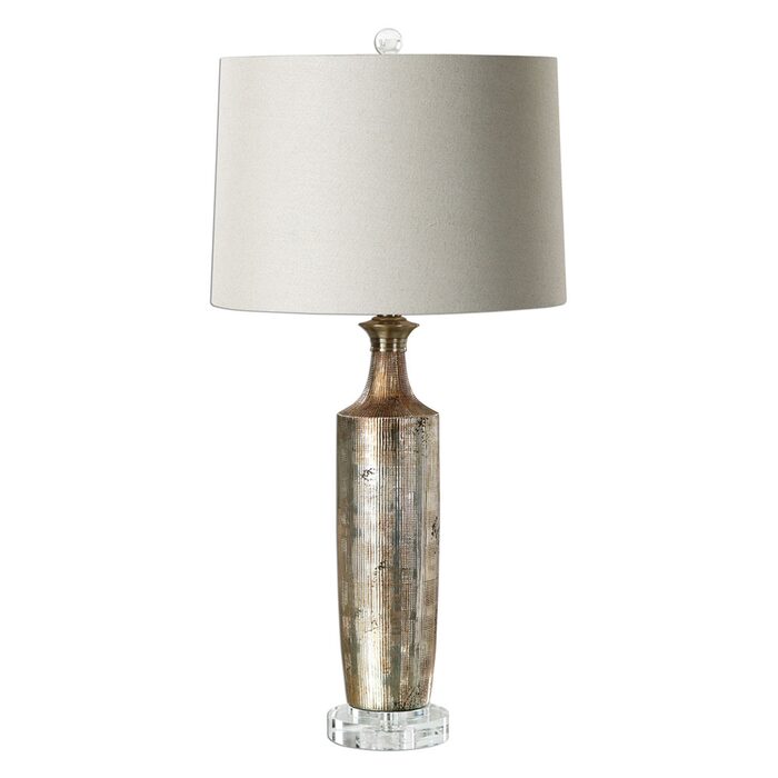 The slightly tapered round hardback shade is a beige linen fabric.