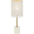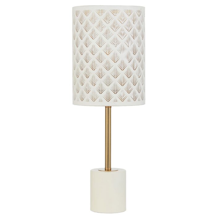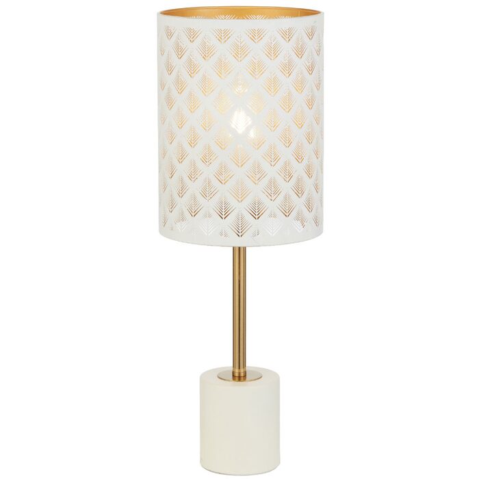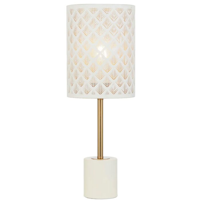 Available in white/antique gold or black/antique gold, each piece features a slim, elegant frame paired with a cylindrical shade detailed with a laser‑cut pattern that casts soft, decorative light.