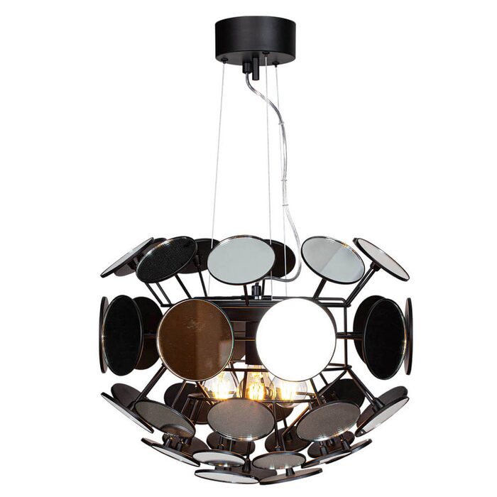 The light sources are surrounded by a black steel frame, which in turn is bedecked with several round, flat mirrors. In the right light, the mirrors can create striking reflections on the surroundings, which brings your whole room to life.