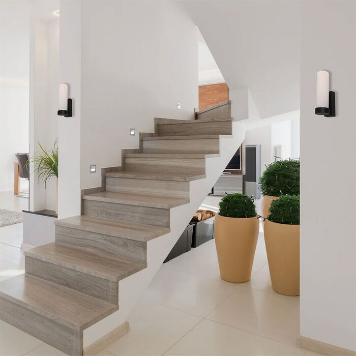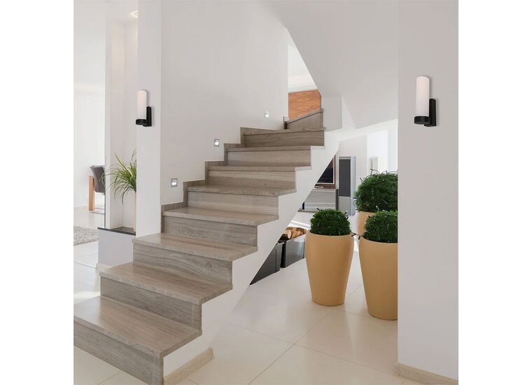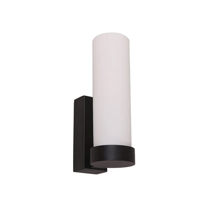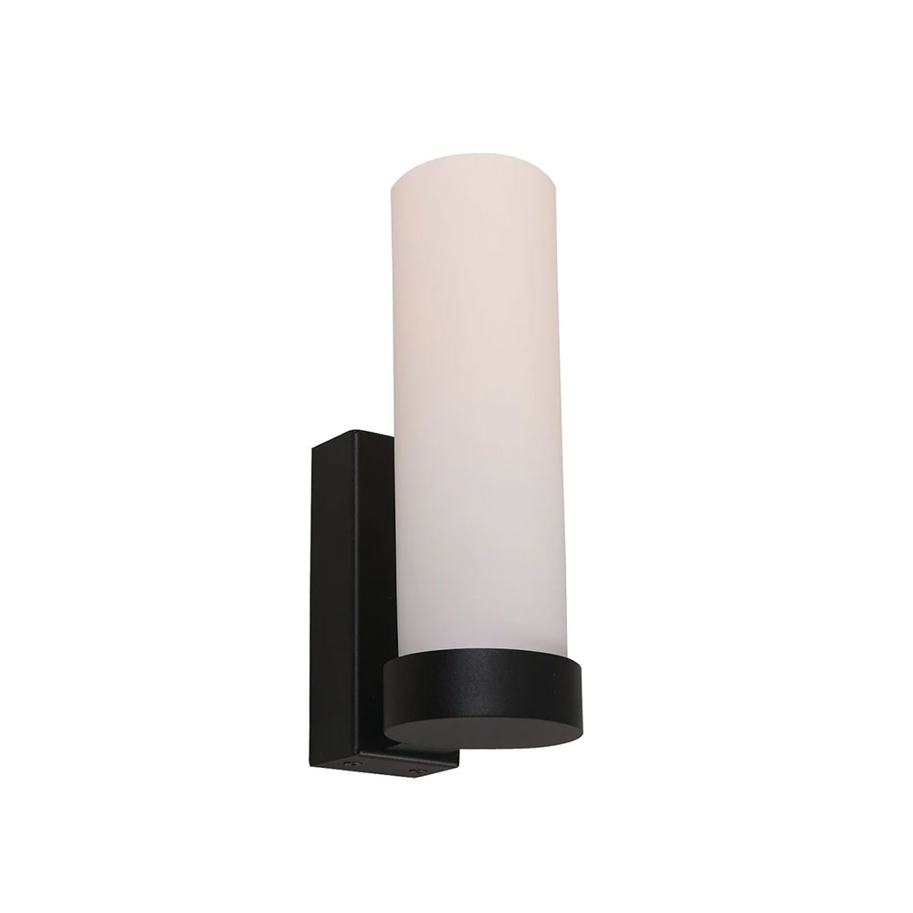 Vara Wall Light Black & Opal features a modern tubular design with an elegant opal glass diffuser that casts a warm, upward glow.