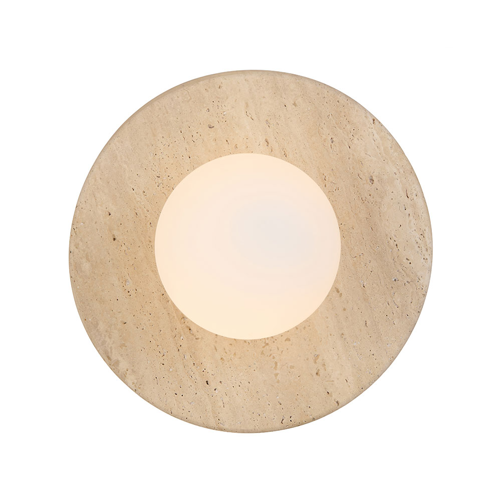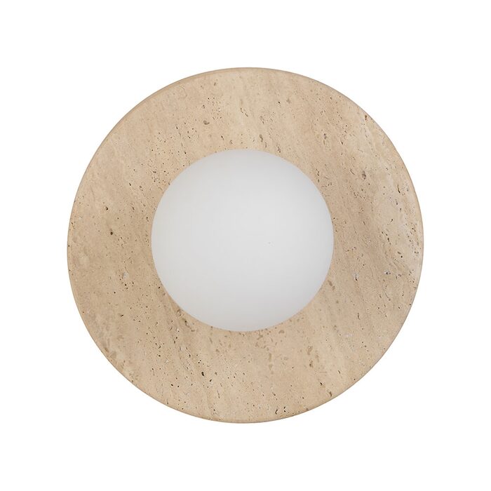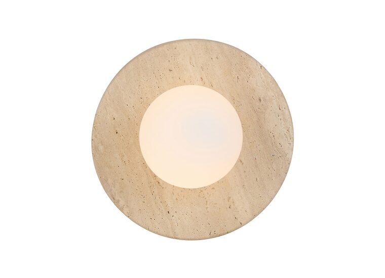 The Varon wall light features a stunning travertine base paired with an elegant opal matte glass shade.