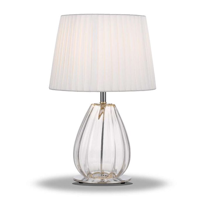 The VEANA table lamp features a sculptured glass tear drop base atop a metal base of antique gold or chrome. The shade is hand wrapped cotton ribbon fabric, lending itself to a variety of contemporary settings.
