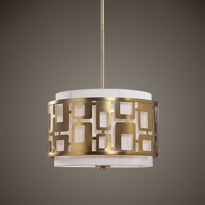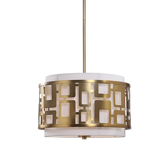 This 3 Lt. Mid-century feel pendant features a floating cut-out retro square pattern in a natural brass finished outer shade, complimented with a white linen fabric inner shade and bottom frosted glass diffuser.