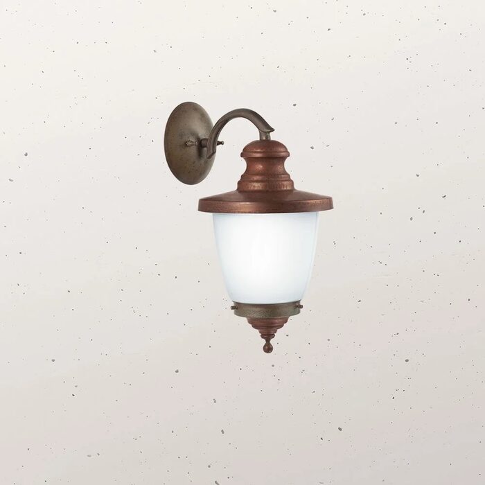 Having a classic taste and elegant design, this outdoor fixture is structured from brass and antiqued copper with either white or “pulegoso” glass finish.