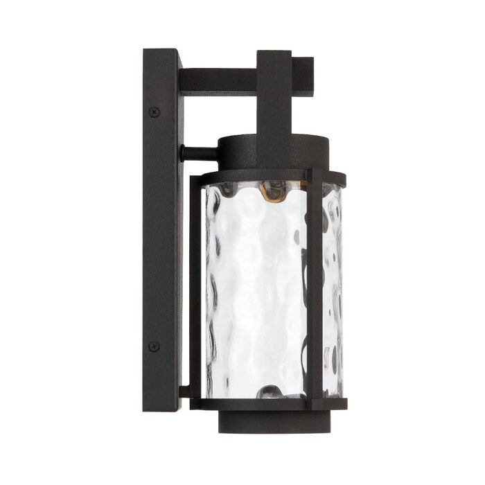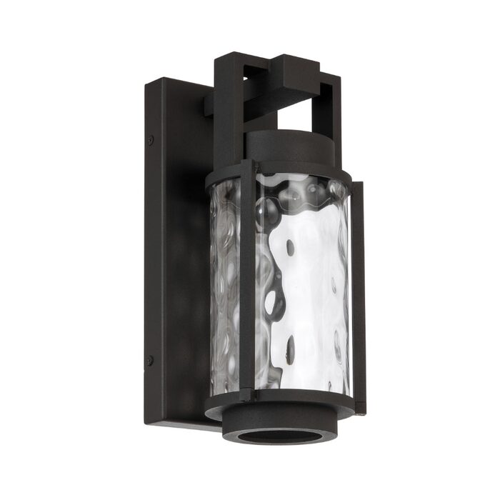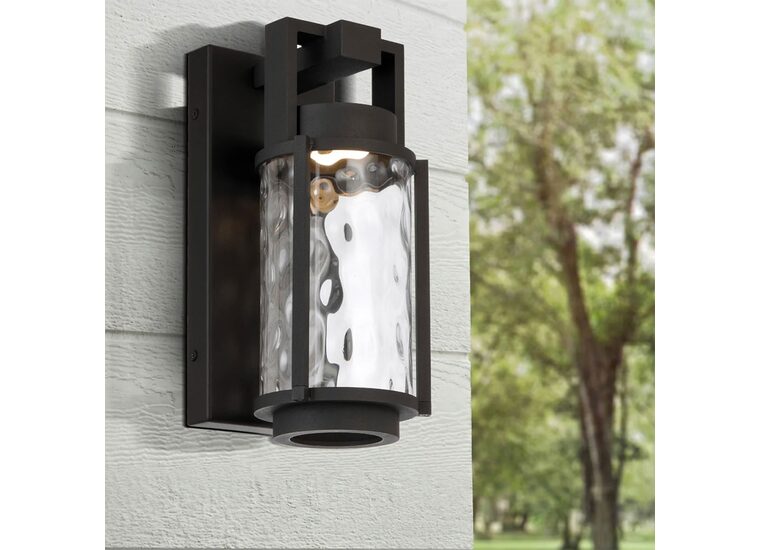 The Vexor outdoor wall light pairs a clean aluminium frame with water-textured glass to create a soft, inviting glow.