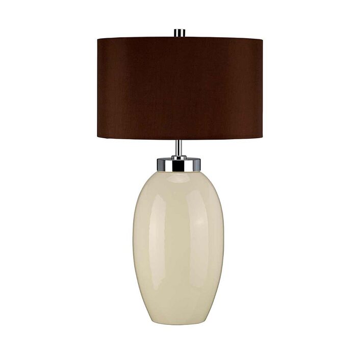 Simple small ceramic table lamp with a Cream glaze. Includes a Brown faux silk hard-backed Empire shade with gold card lining.