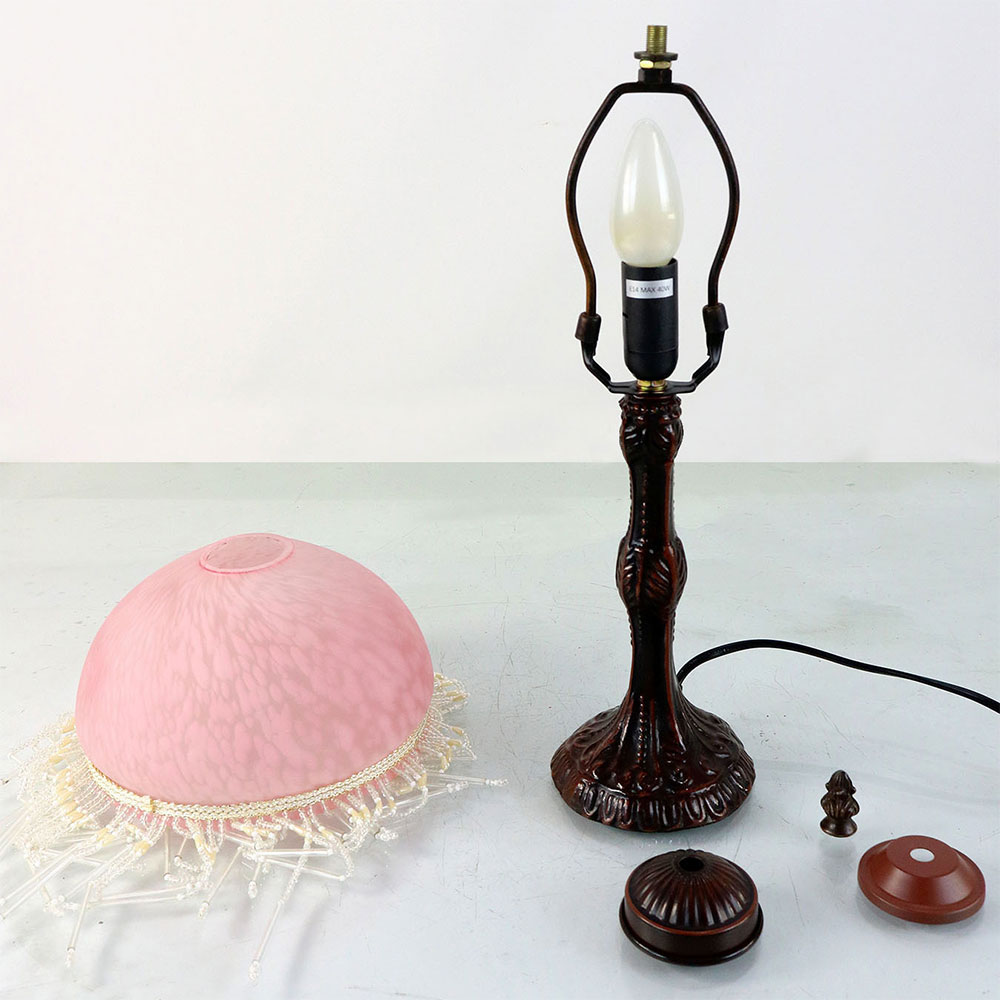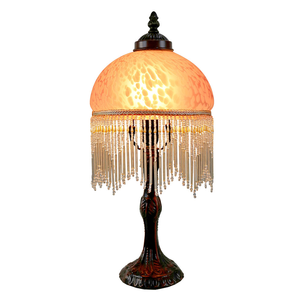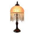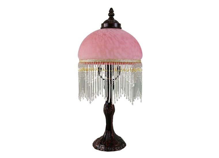 Inspired by the Art Deco period, the Victorian table lamp features a pink glass shade combined with hanging beads, and a dark Bronze polyresin base.