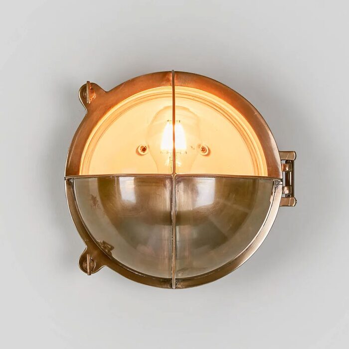 Our Vienna outdoor wall lamp is marine nautical wall light with half round metal cover with clear glass that adds nautical charm into indoor or outdoor industrial style space.