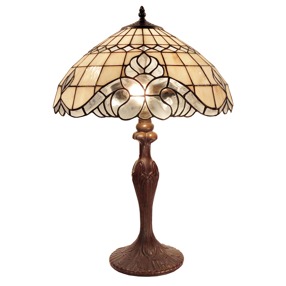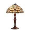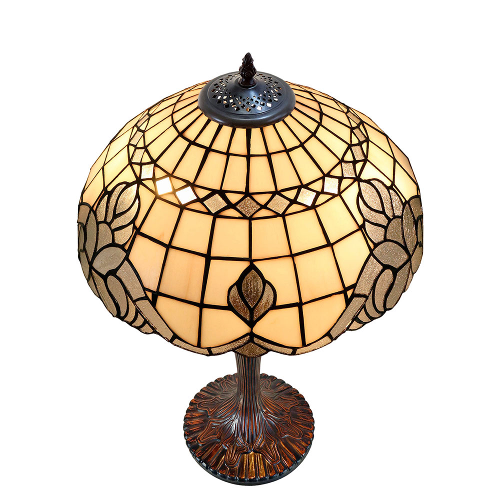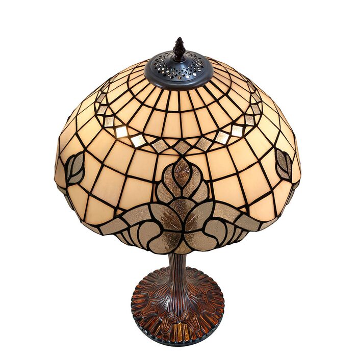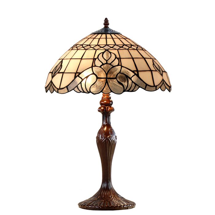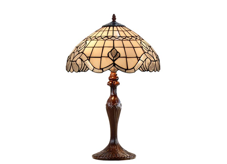 This beautiful table lamp features a handcrafted, genuine Vienna design on stained art glass shade combined with a resin base, carved in a traditional design with a brown neutral colour to juxtapose the lively art glass shade for maximum impact.