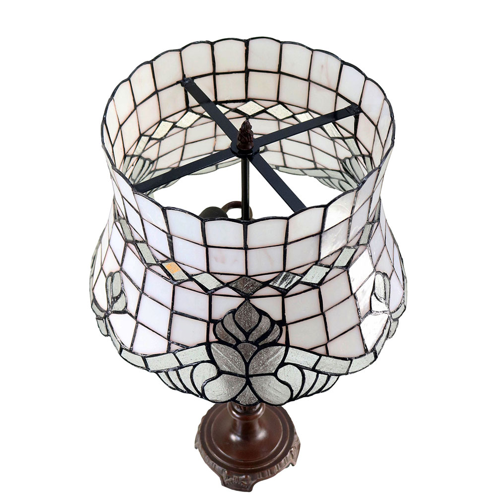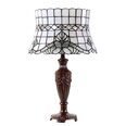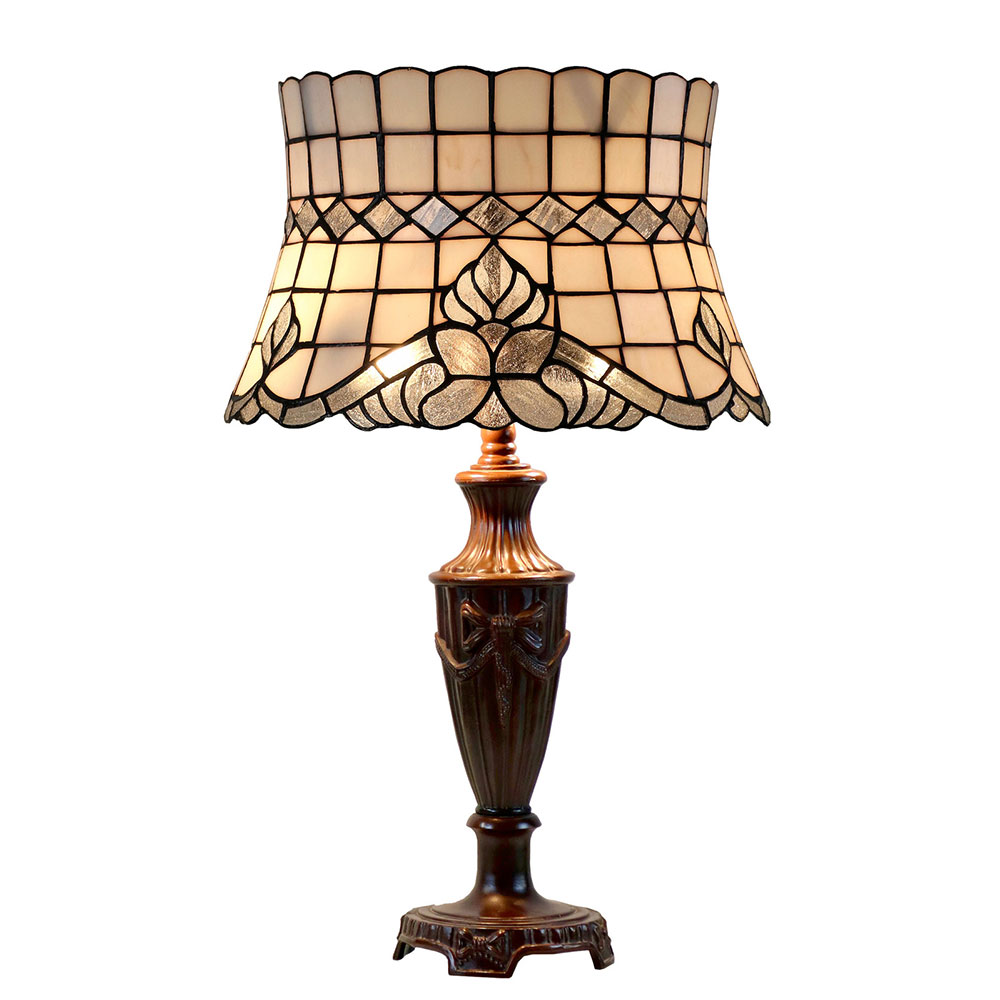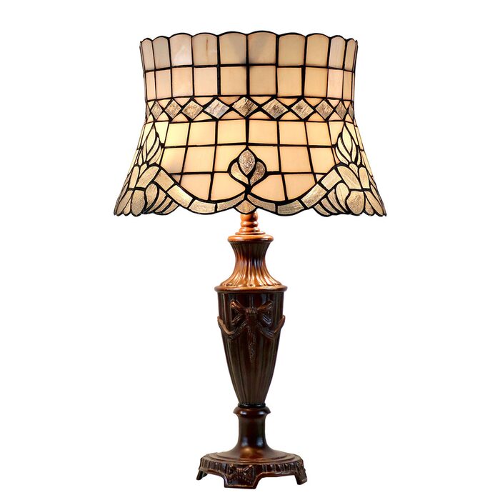 This beautiful table lamp features a handcrafted, genuine Vienna design on stained art glass shade combined with a resin base, carved in a traditional design with a brown neutral colour to juxtapose the lively art glass shade for maximum impact.