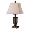 Oil Rubbed Bronze With Gold Highlights. The Square Bell Shade Is A Beige Linen Fabric.