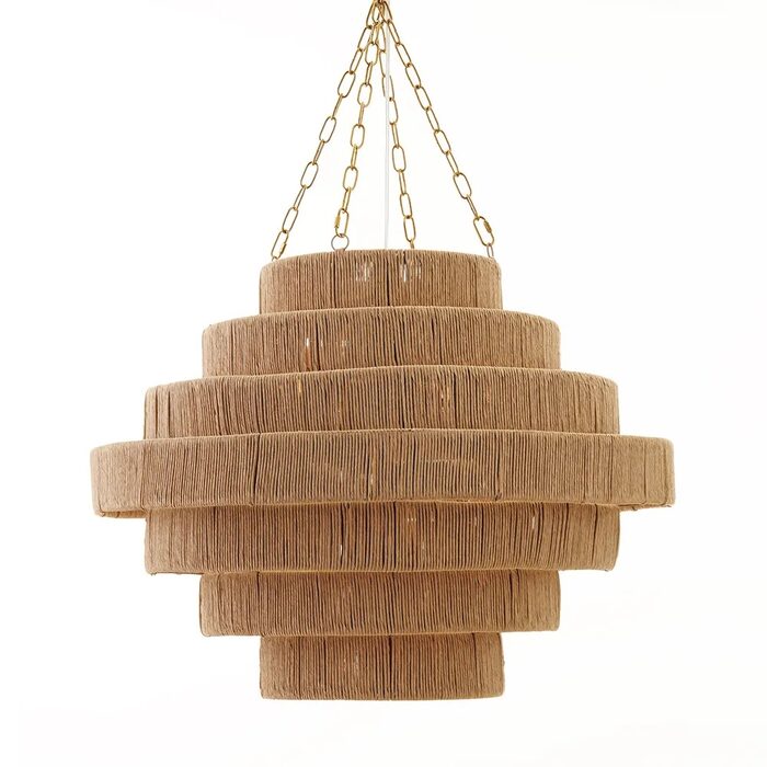 An unobtrusive beauty, the sizeable Vilano wide pendant features a paper rope hand woven around a 7 tiered iron frame infusing modern interiors with organic warmth.