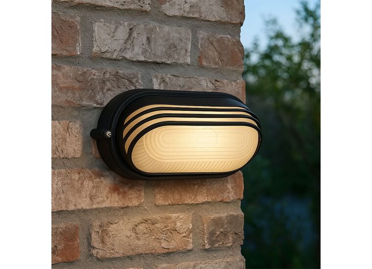 Experience timeless industrial charm with the Virell Oval Louvered Bunker Light, featuring a classic retro oval bunker shape and distinctive louvered detailing, perfect for exterior applications like gardens, balconies, porches, and outdoor walls, while its elegant semi-frosted patterned glass diffuser creates a warm, inviting ambiance suitable for indoor spaces such as industrial lofts, kitchens, living rooms, corridors, restaurants, and hotels.