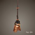 Hand wrought, oil rubbed bronze metal curls around heavy, hand made glass.