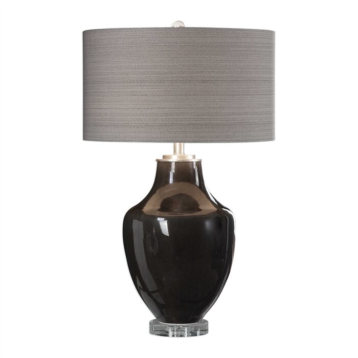 This ceramic lamp is finished in a high gloss, crackled dark gray glaze, with silver leaf accents and thick crystal details.