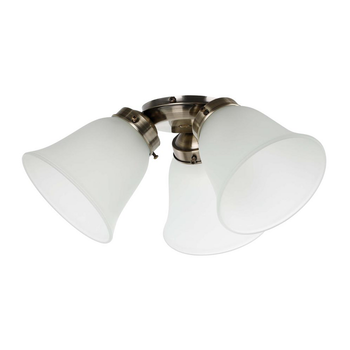 Waikiki 3 light flush fan light kit is fitted with glass shades, and a pull chain to suit all the Waikiki ceiling fans. Suitable for 3 x E27 base compact globes, in either energy saving LED, or energy saving halogen globe options.