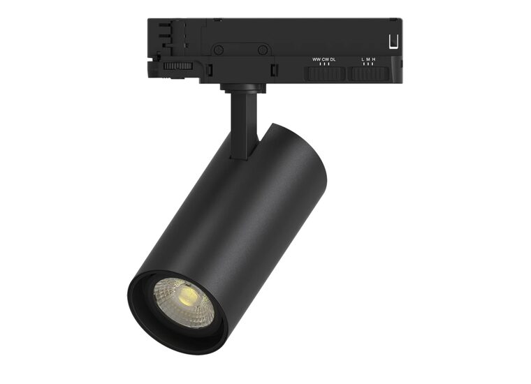 Decorative three circuit, rotatable LED track light, with selectable CCT and power.