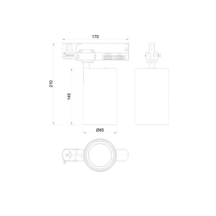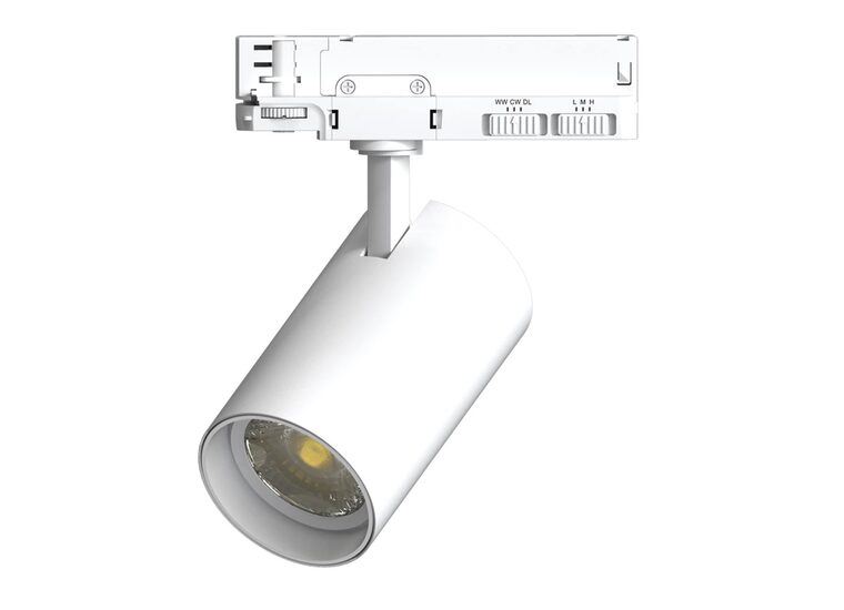 Decorative three circuit, rotatable LED track light, with selectable CCT and power.