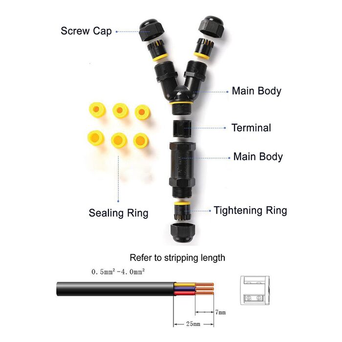 - Refer to stripping length: External stripping 25mm; Internal stripping 7mm