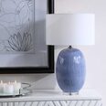 This refined table lamp features a classic blue ceramic base with white subtle undertones and organic vertical texture, paired with sophisticated polished nickel and crystal accents.