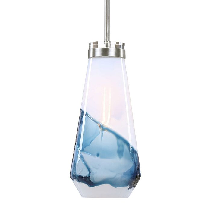 The feeling of windswept sky & clouds are brought to life in this pendant with a focus to the swirling white & blue handmade glass shade, each piece will have slight variations.