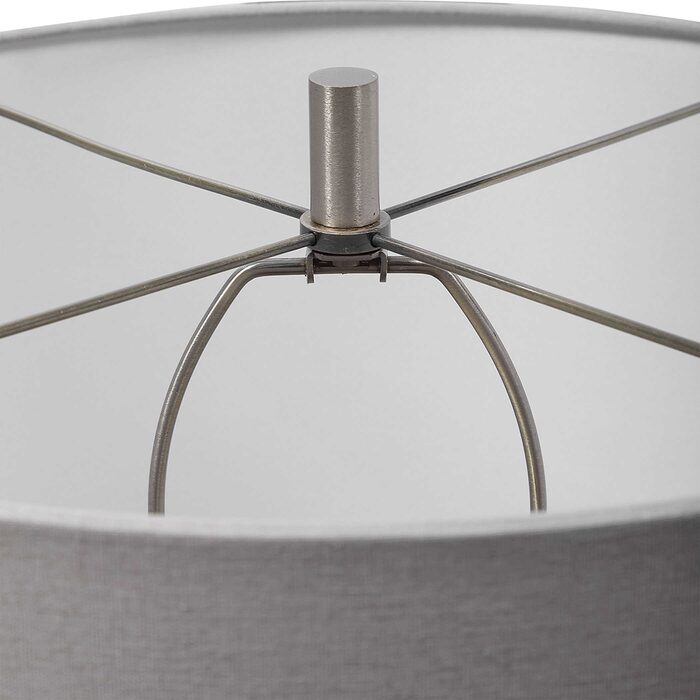 The lamp is paired with a light gray linen fabric drum shade.
