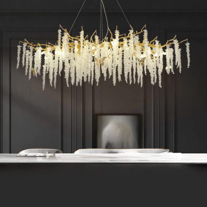 The pendant light is a true work of art with its exquisite crystal drops and beautifully handmade metal frame that adds a touch of glamour to any space.