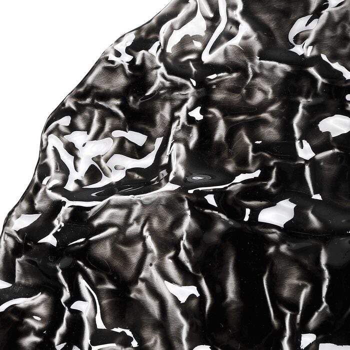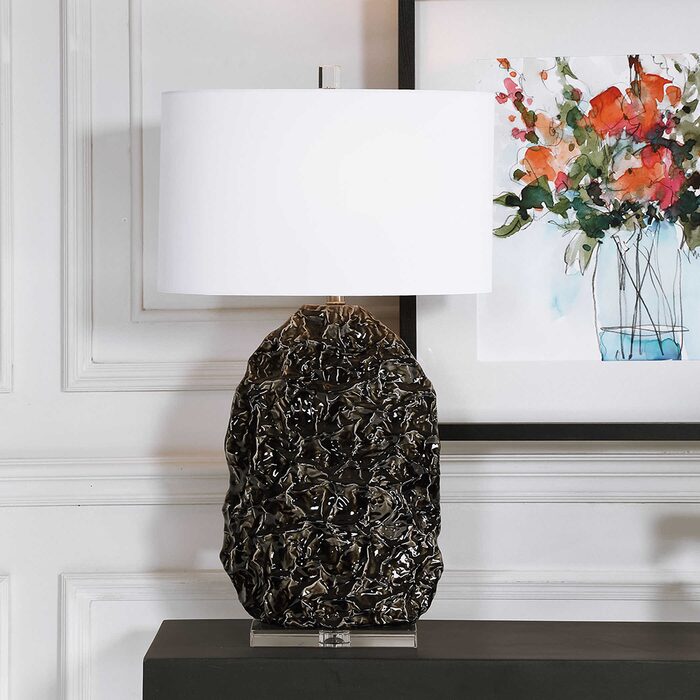 A modern statement piece, this ceramic table lamp features an organic design with a gloss black glaze and subtle ivory rub-through details.