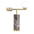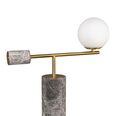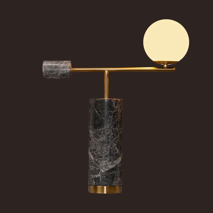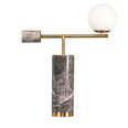 Crafted with polished grey marble featuring stunning white veining, this lamp is beautifully contrasted with warm brass accents and a soft, milky-hued orb.