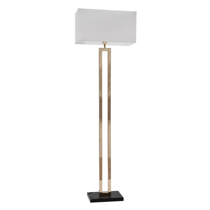 Simple modern floor lamp design. Gold floor lamp, with white fabric shade black base. Tilt adjustable shade.