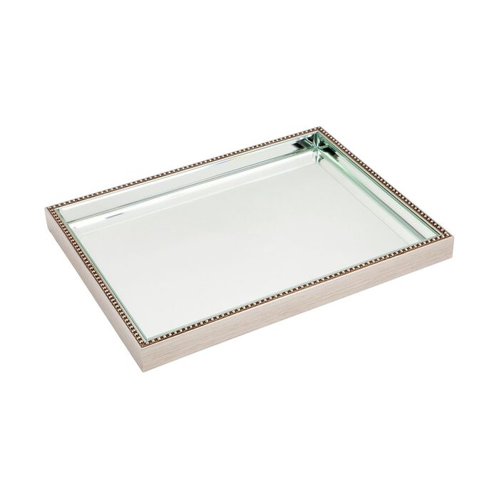 Antique silver finished beaded rectangular frame, lined with clear mirror glass finished with a bevelled edge.