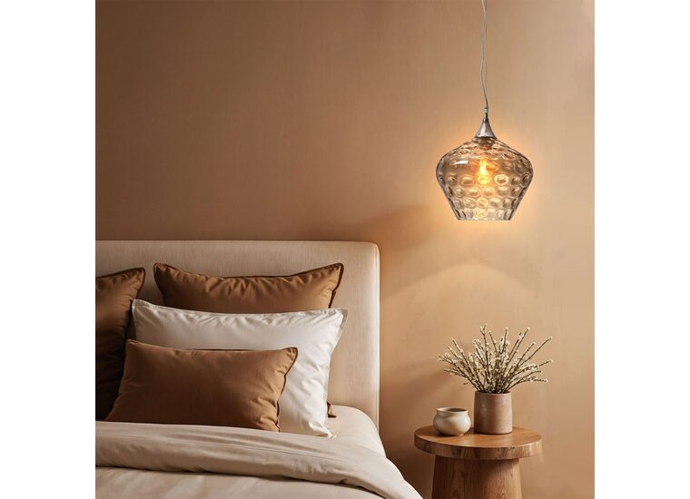Its wavy blue or amber glass design offers a unique and eye-catching appeal, complemented by sleek chrome fittings and a matching ceiling plate for a contemporary finish.